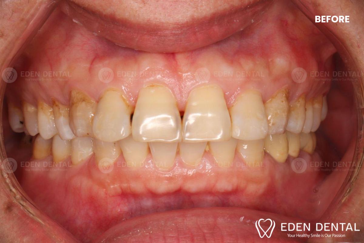 Tình trạng ban đầu Răng cửa hàm trên hình giác, tuột nướu, lộ tam giác đen vùng nướu Răng 2 hàm ố vàng, đổi màu do sâu răng, nhiễm màu…