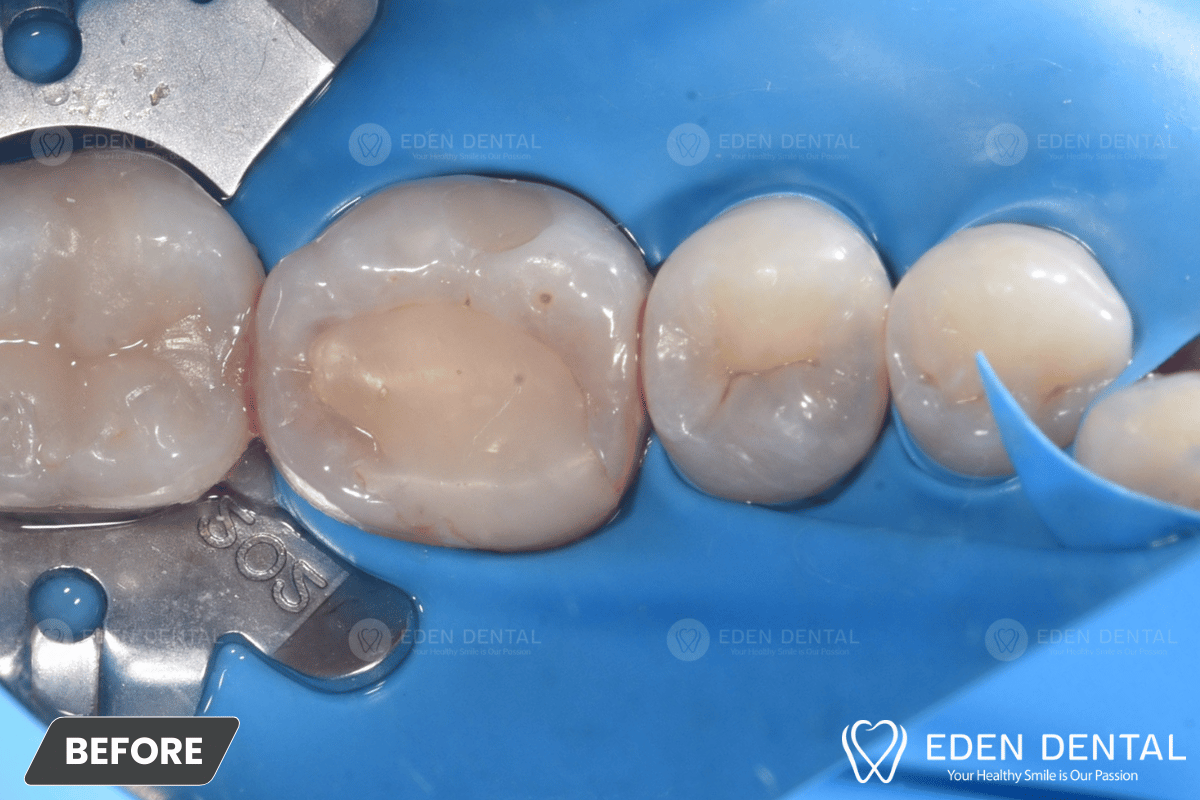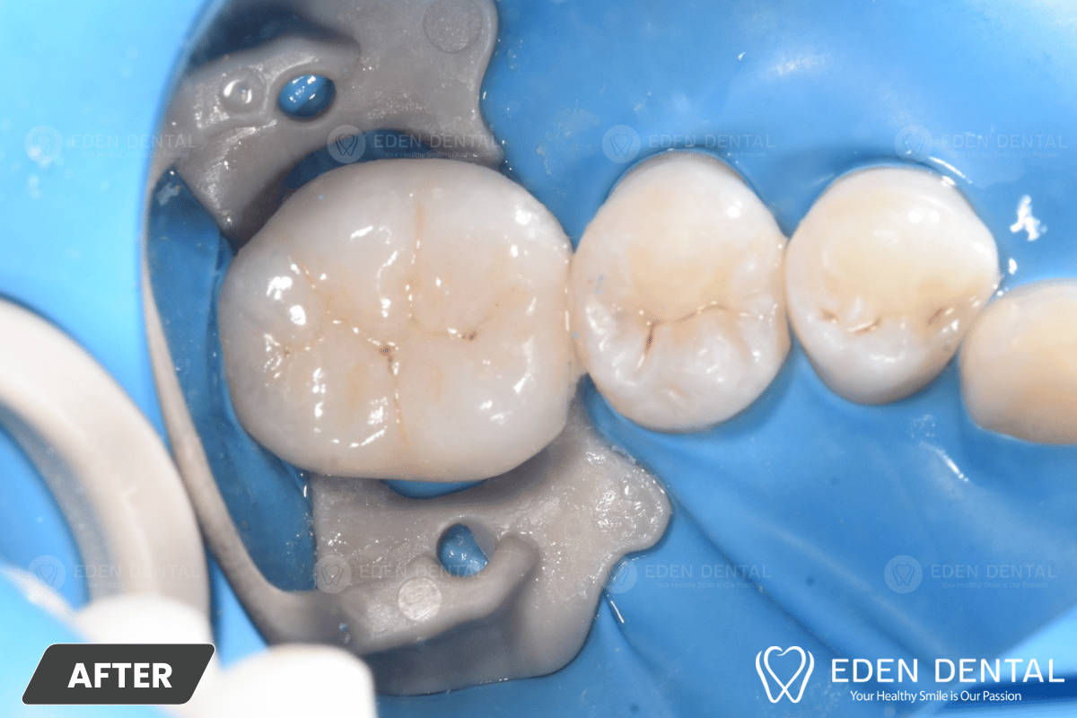 Tình trạng ban đầu Răng 46 đã nội nha (chữa tuỷ) hơn 10 năm Ăn nhai không đau Miếng trám Composite đã được thay mới vài lần X- quang:…